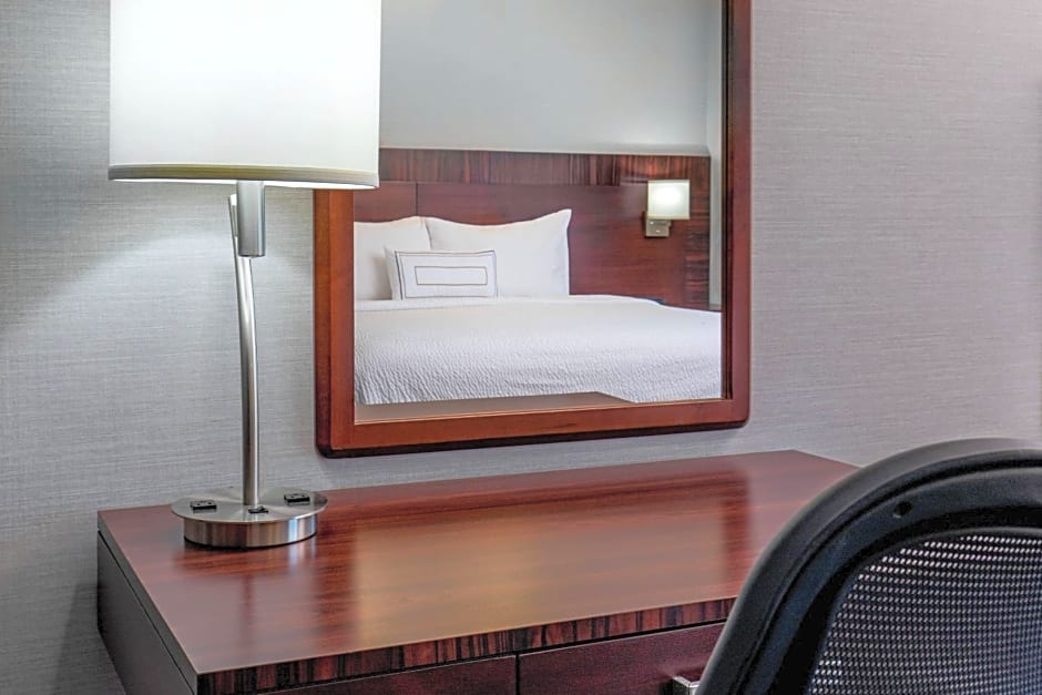 Room has a work desk and a seating area with chair.